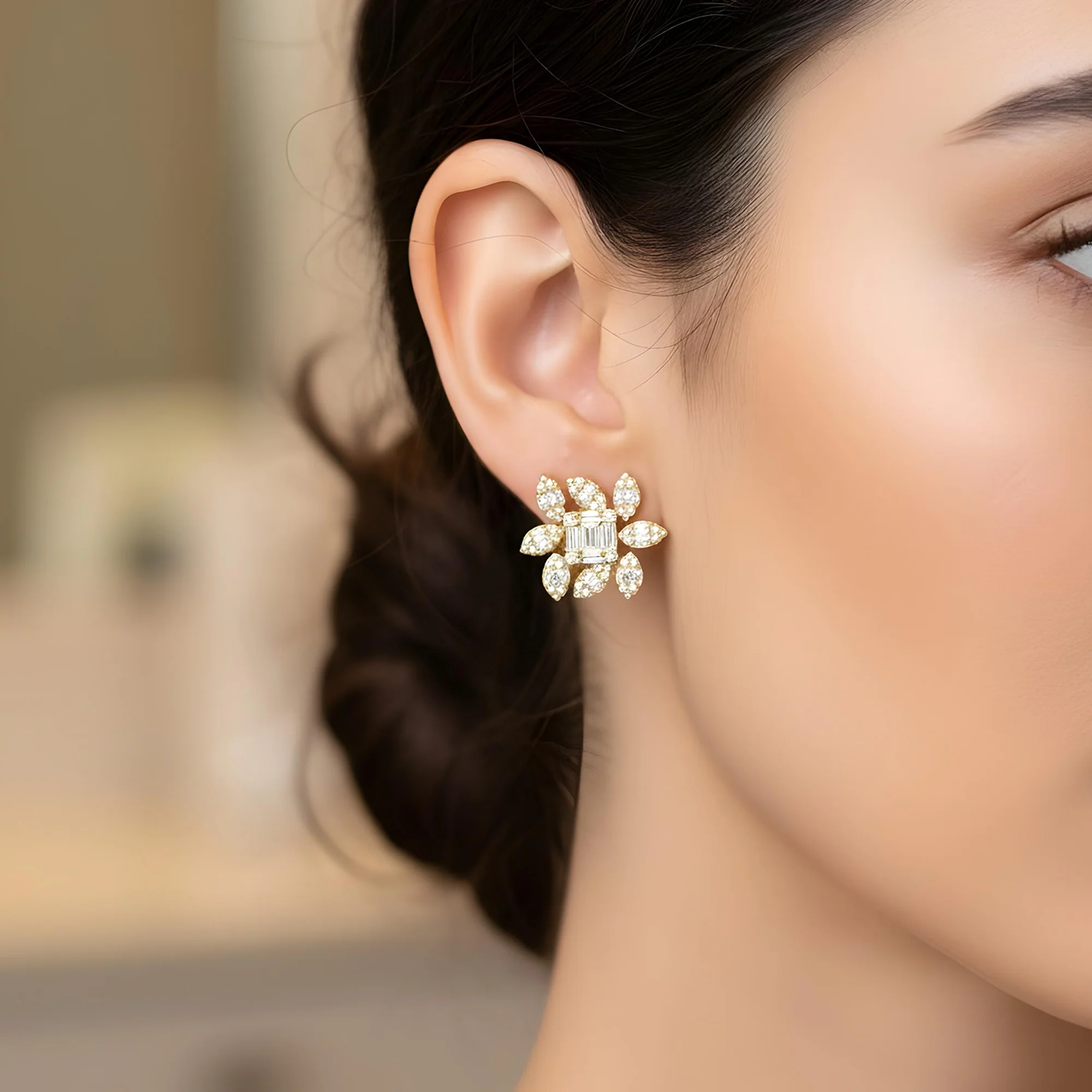 14K White Gold Baguette Diamond Flower Stud Earrings 3.35ctw