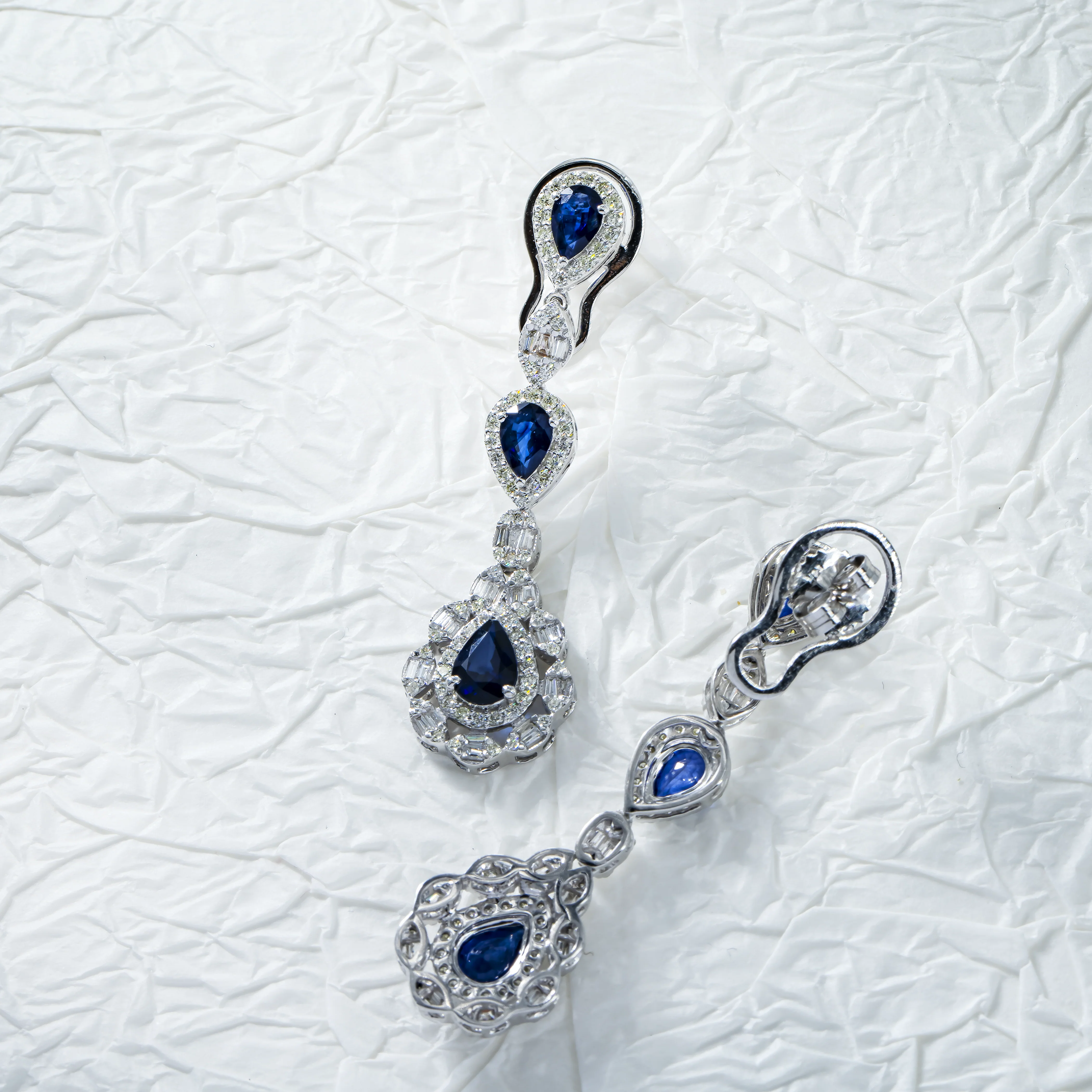 14K White Gold Pear Cut Sapphire & Diamond Drop Earrings