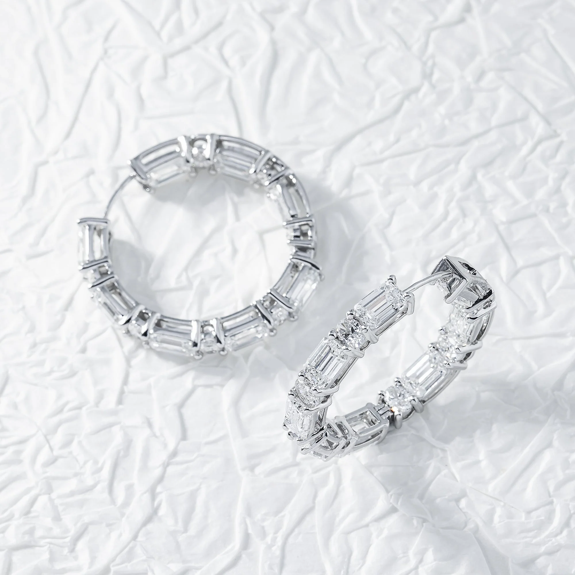 14K White Gold Round & Emerald Cut Diamond Inside Out Hoop Earrings 12.05ct