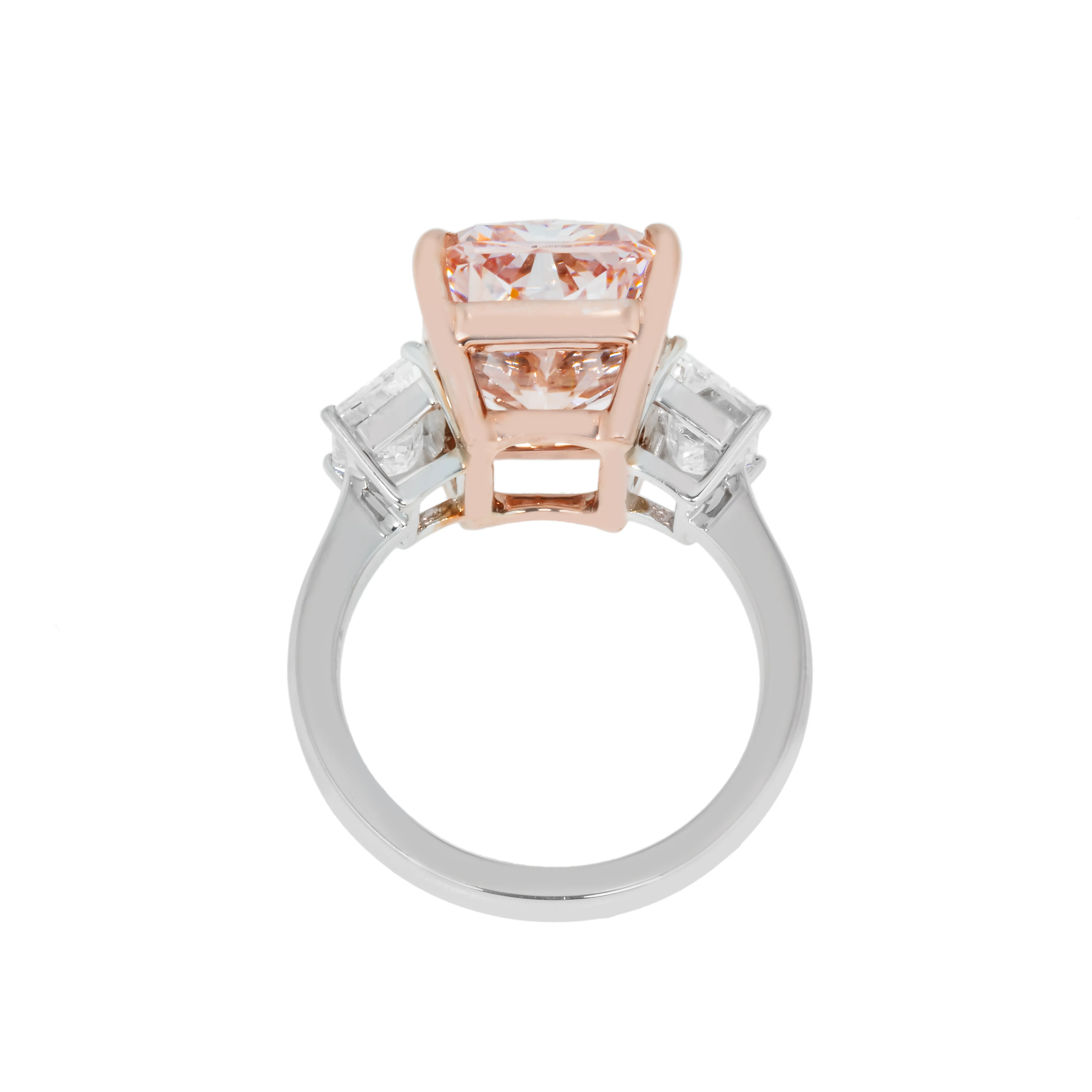 Additional Details: 18K rose gold center stone set & two triangle cut side stonesÂ