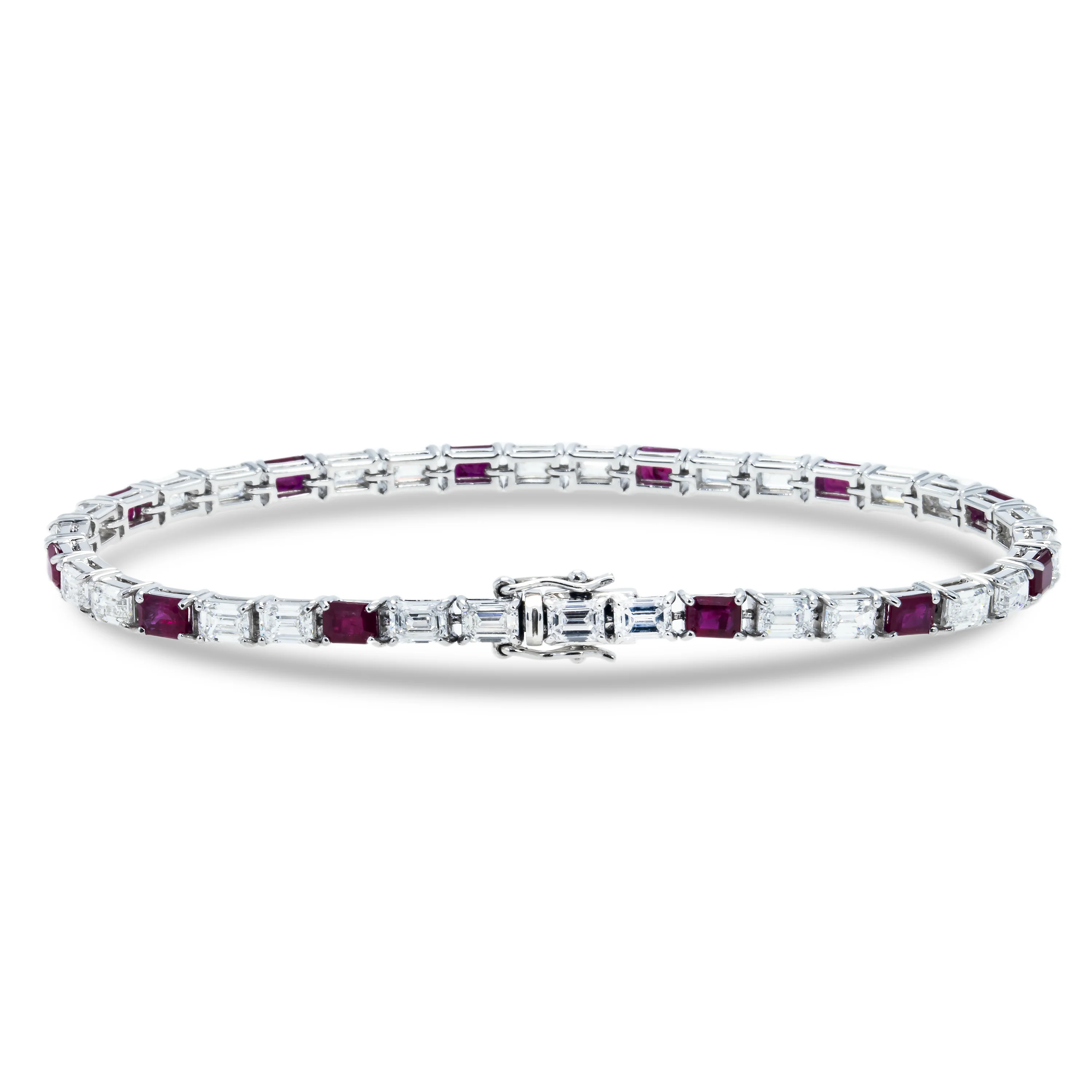 18K White Gold Emerald Cut Ruby & Diamond Tennis Bracelet