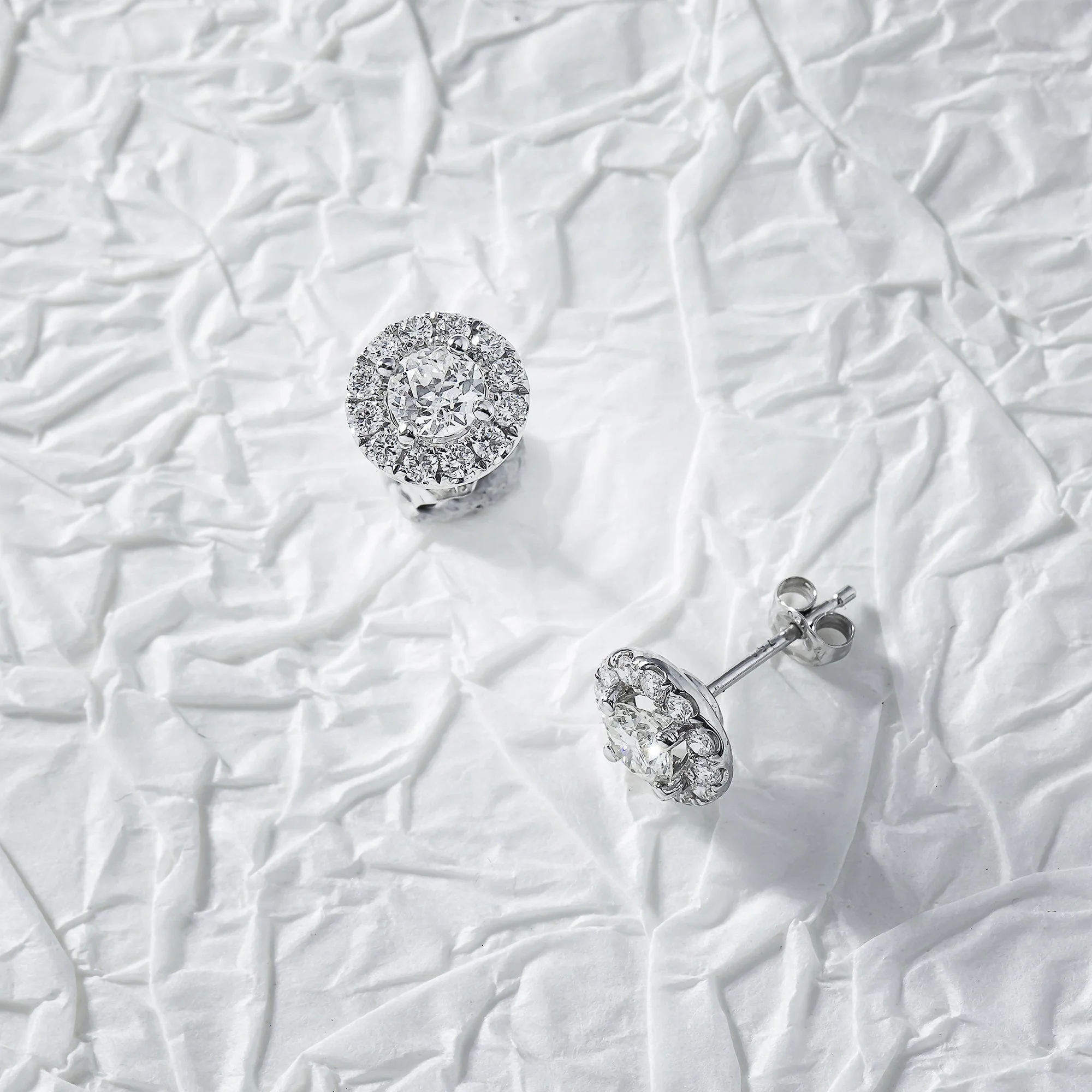 18K White Gold Round Diamond Halo Stud Earrings 1.35ctw