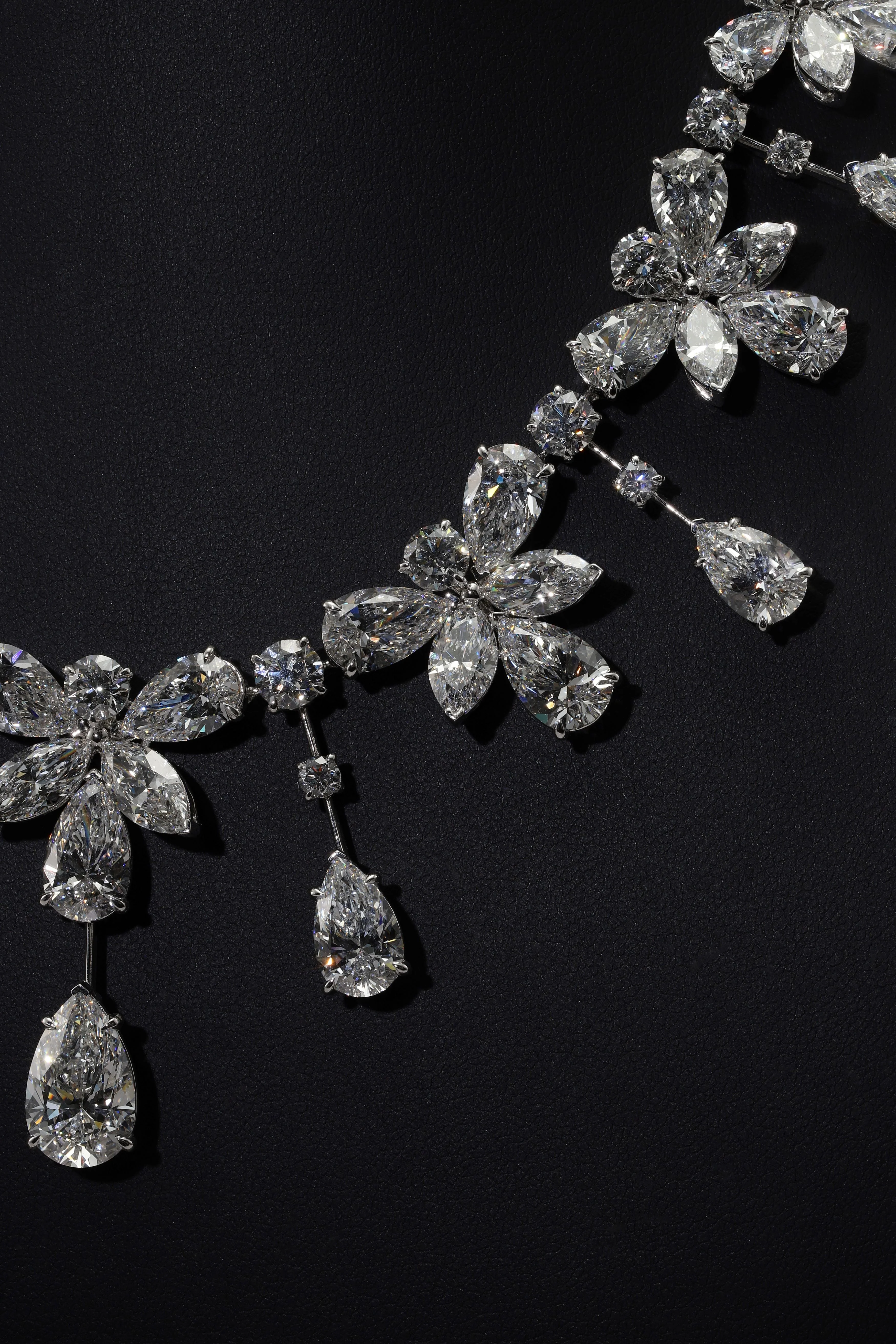 18K White Gold Round & Pear Cut Diamond Necklace 85.85ct