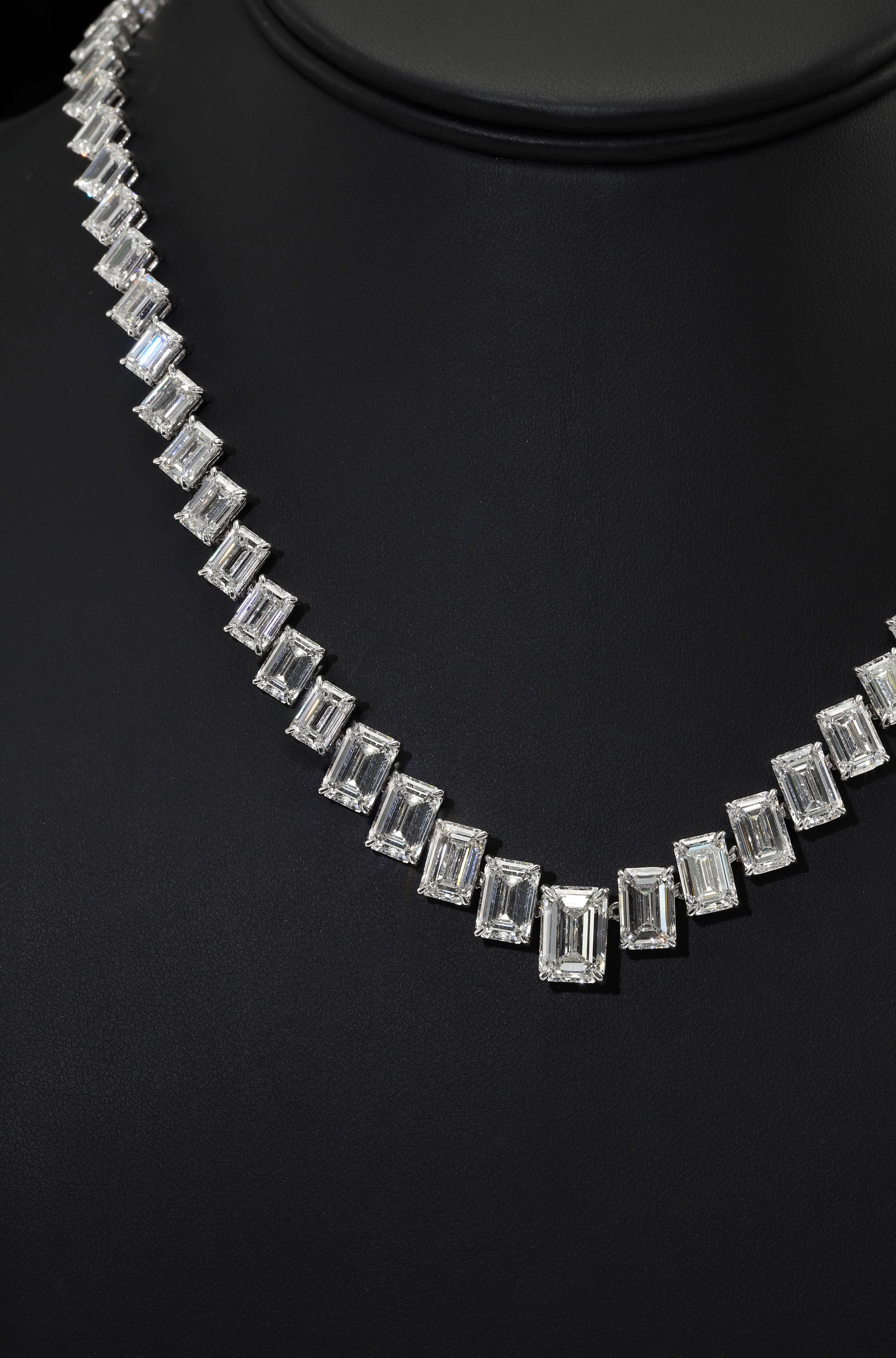 18K White Gold Graduated Emerald Cut Diamond Necklace 55.56ct