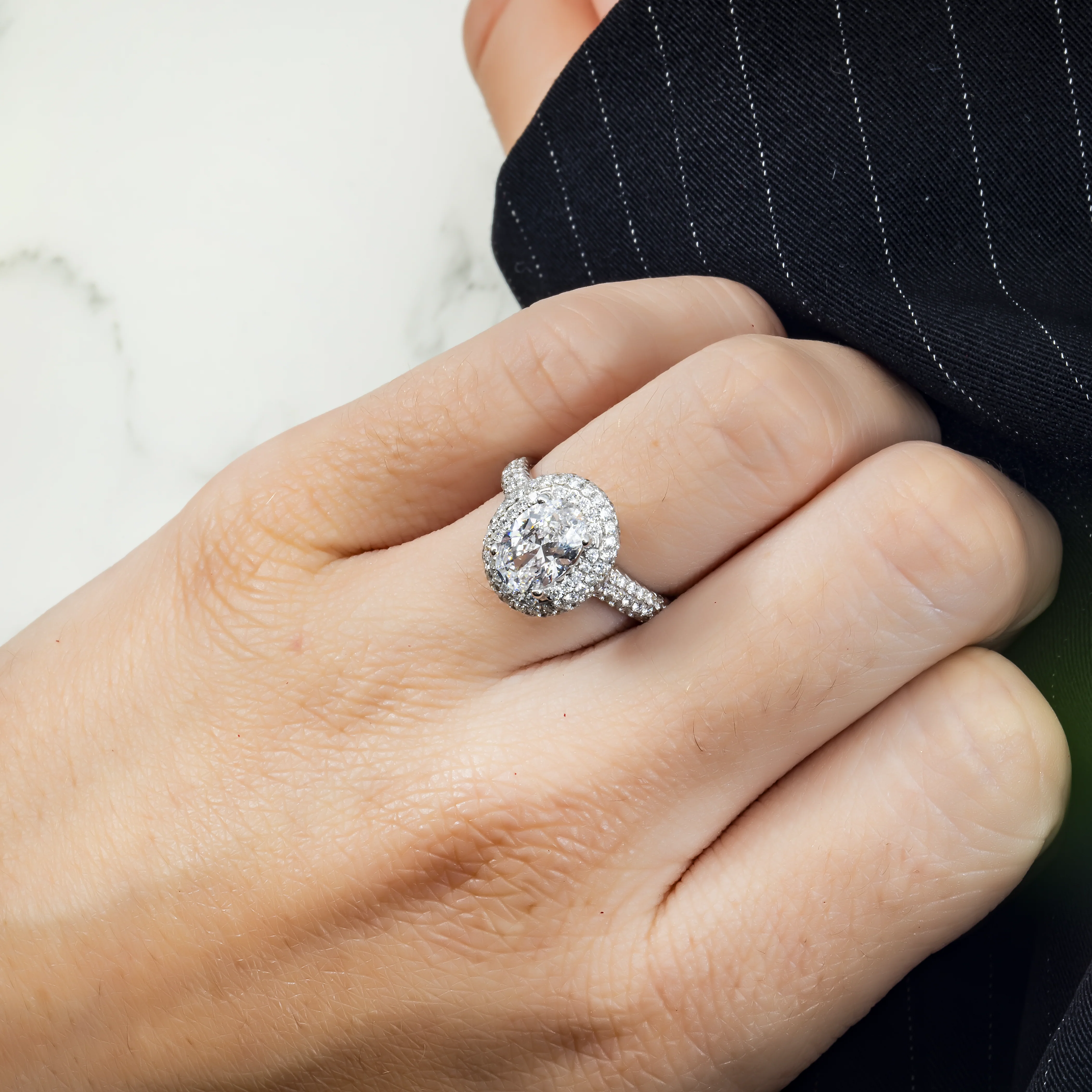 Additional Details: round cut diamond halo & triple row diamond bandÂ