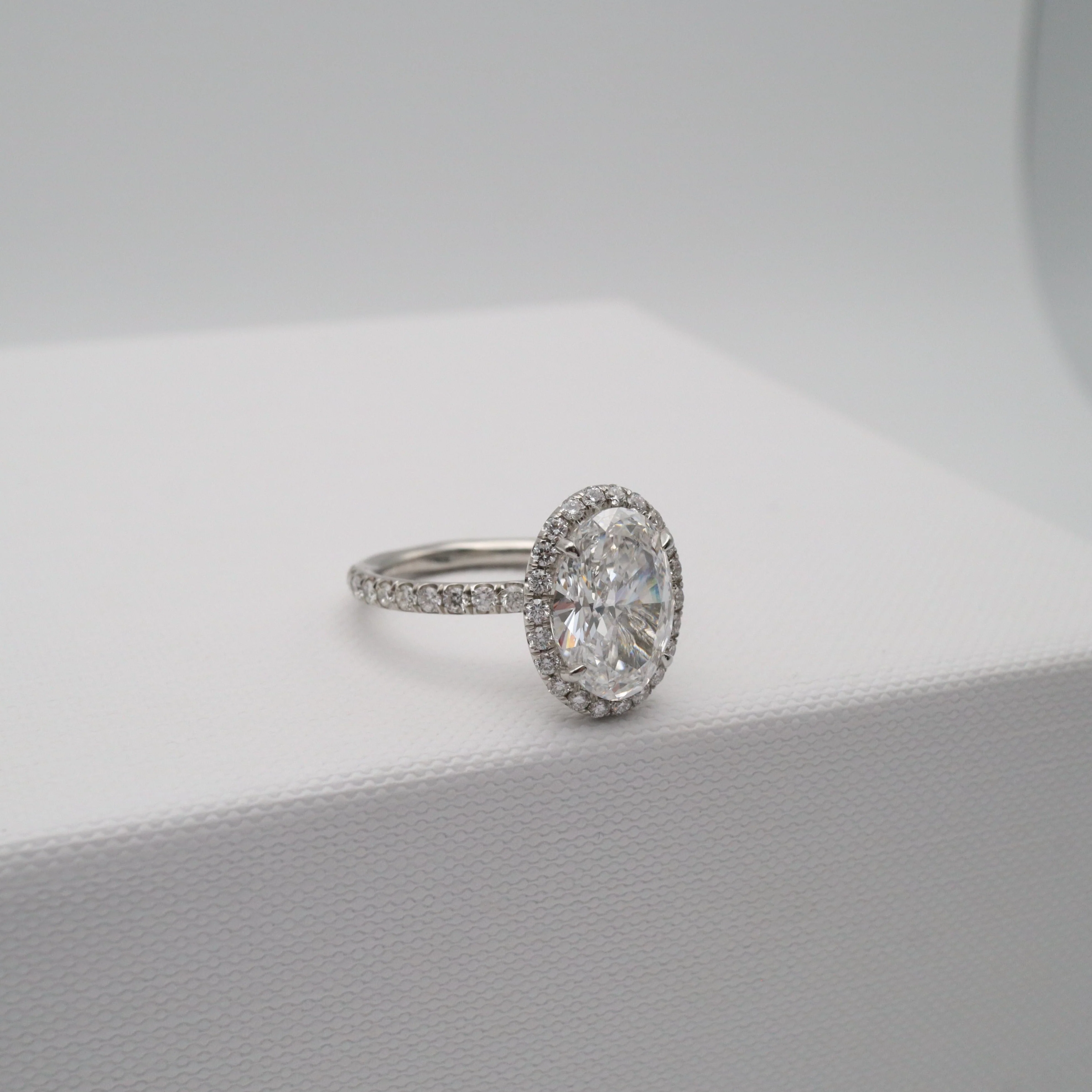 GIA certified earth mined oval cut diamond engagement ring with a round diamond halo & 3/4 diamond band in a platinum setting