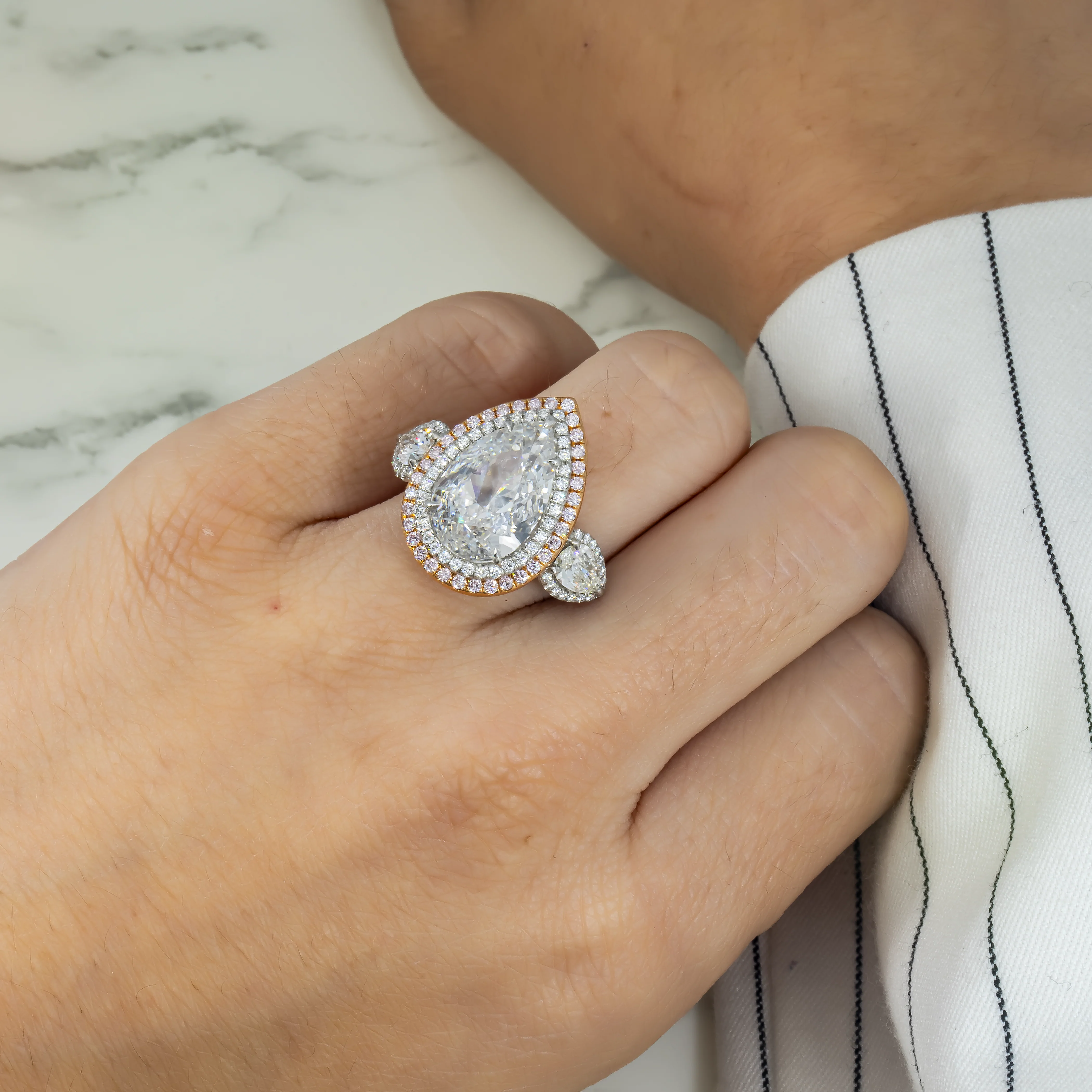 Additional Details: two pear cut diamond side stones, round cut diamond band, & pink diamond halo